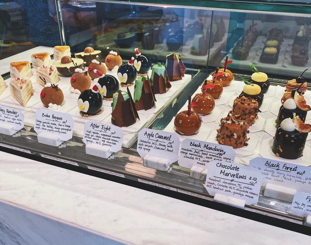 For the macaron enthusiasts, there are several tantalizing varieties, including mango and jasmine, yuzu, pistachio, chocolate, yoghurt and mandarin, passionfruit, and Sherry PX with raisins. Moving down the line are some creatively-named pastries each more curious than the last, with wholly unique combinations of colours, shapes, and flavours. At the other end, their grand pièce de résistance, the Creme Brulee mille crepe cake, makes choosing just one sweet treat to indulge in a nearly impossible task.